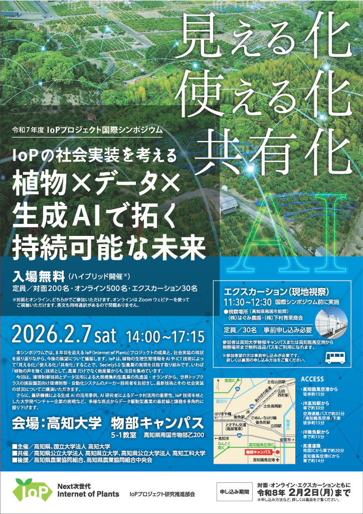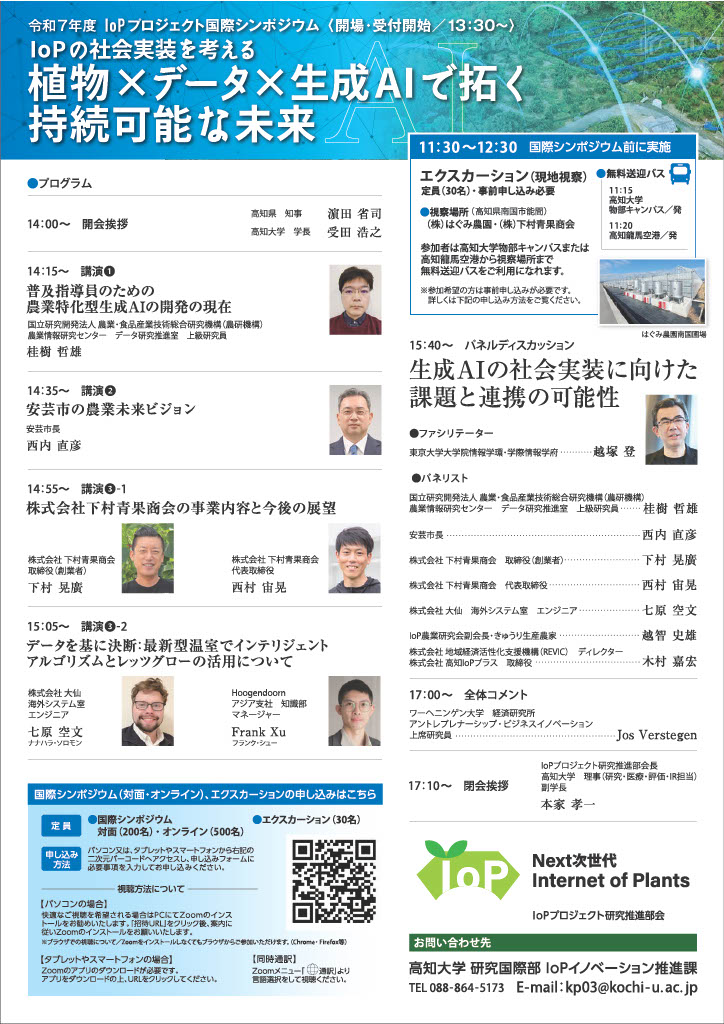 今回は「IoP の社会実装を考える:植物×データ×生成AIで拓く持続可能な未来」をテーマに、生成AIの研究者、安芸市長、県内を代表する篤農家(※)、更にオランダからAIを組み込んだ環境制御機器メーカーをお招きし開催いたします。